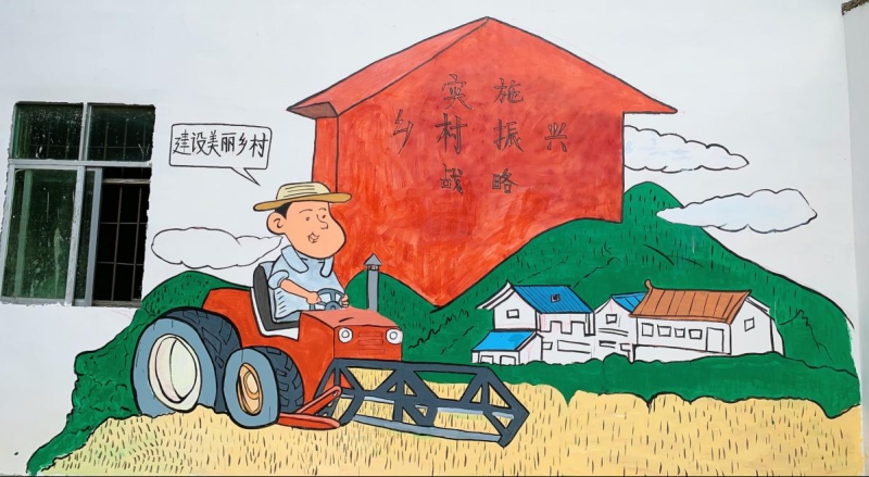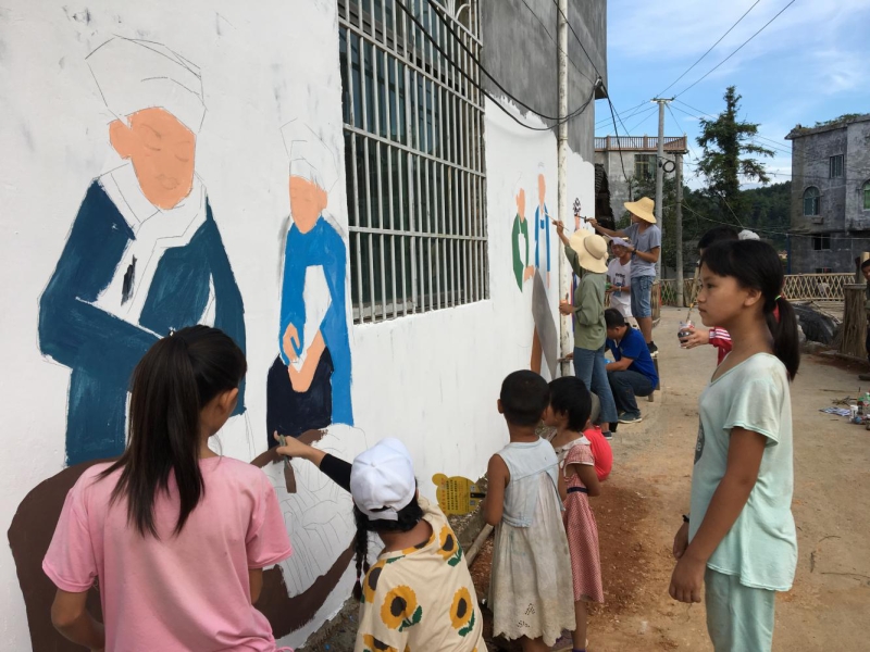 在国家大力实施乡村振兴战略的背景下,需要让所有村民了解乡村振兴战略,让文化变信仰,让信仰变力量,而“实施乡村振兴”这幅墙体彩绘恰是服务队要绘制的第一面墙体的主要内容。经过一天的努力,墙绘已初见雏形,在完成这幅墙绘照片的基础上,搭配传统美德“孝”、“礼”、“志”和“学”,呈现了一幅具有“思想政治”和“道德素养”的文化墙绘。