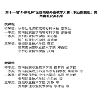 “外教社杯”全国高校外语教学大赛是高校英语教师展现外语教学水平和个人素养的舞台,相信在未来,我院教师会继续为贵州省高职英语教学交流及教学水平的提升做出应有的贡献。