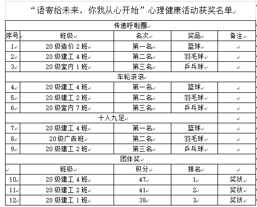 通过此次心理健康活动的开展,让大家感悟到:在人生的道路上,需要用一颗积极阳光的心态去面对生活、学习中诸多的坎坎坷坷和困难;同学、朋友之间需要团结合作,才能携手向前;学会融入集体,用团队的力量解决困难。