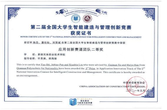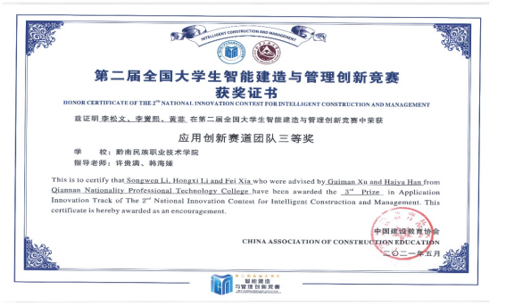 为了贯彻落实《国家职业教育改革实施方案》文件精神,培养同学们熟练掌握工程软件的操作技能,实现“以赛促学、以赛促教”的理念。建筑系组织许贵满、韩海娅老师,带领施垚、李松文等6名同学组成两支参赛团队,参加由中国建设教育协会主办第二届全国大学生智能建造与管理创新竞赛,经过一个多月的努力训练,两支团队最后以优异的成绩分获全国团体二等奖、三等奖。