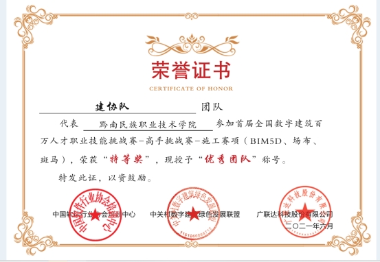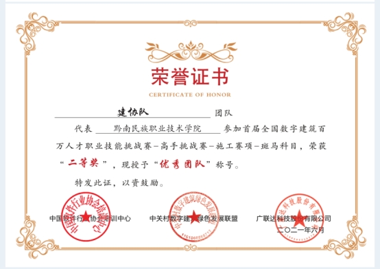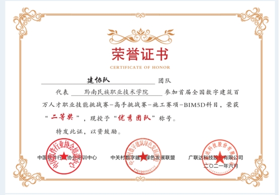 建筑系许贵满、韩海娅老师指导的建协队、创新队、量建队、激光队四支队伍表现优异,共斩获特等奖1项、二等奖4项、三等奖1项、优秀奖1项、优秀组织奖2项、最佳组织奖6项。同时,参赛学生还在造价赛项-GCCP、施工赛项-场布、施工赛项-斑马三个赛项中包揽贵州前三甲。