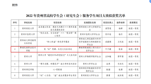 2022年11月21日,建筑工程与设计系学生会“饮水思源,红色文化在身边”项目代表黔南职院参加共青团贵州省委主办的贵州省高校学生会(研究生会)服务学生项目大赛,与本科院校的本科生、研究生同场竞技,从180支参赛队伍中脱颖而出荣获一等奖。