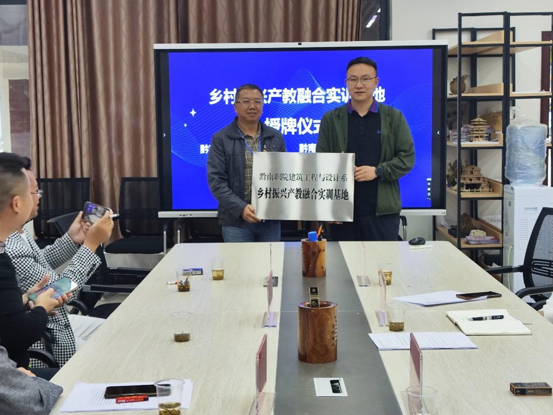 会中举行了黔南职院建筑系乡村振兴产教融合实训基地授牌仪式,建筑系党总支书记潘奇为黔南州装饰建材行业商会进行授牌,商会会长孟达接牌。