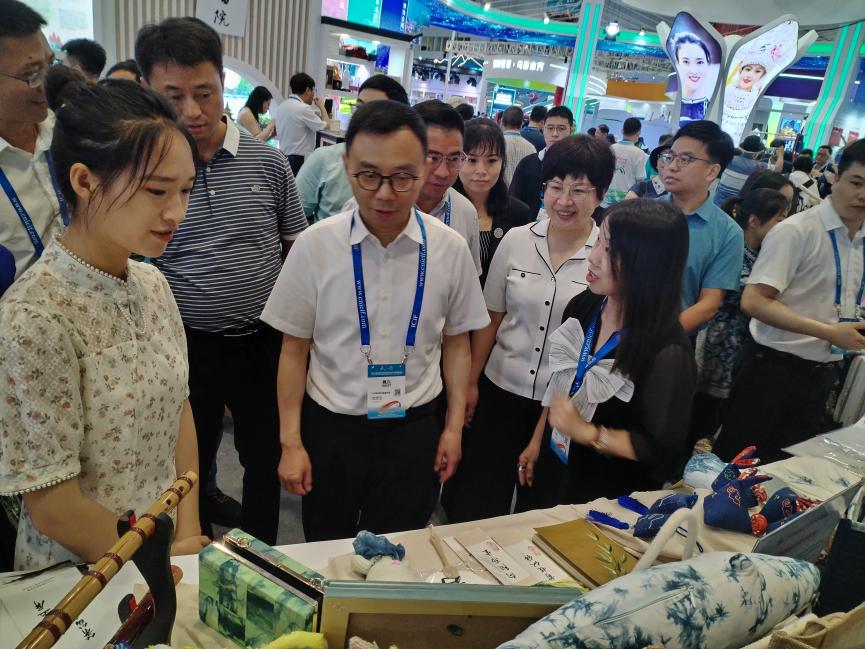 在贵州主题馆特色文创产品展区,婳意艺术工作室的蜡染、苗绣文创产品参加展会,展示内容新颖时尚,参展嘉宾纷纷驻足围观,产品深受好评。