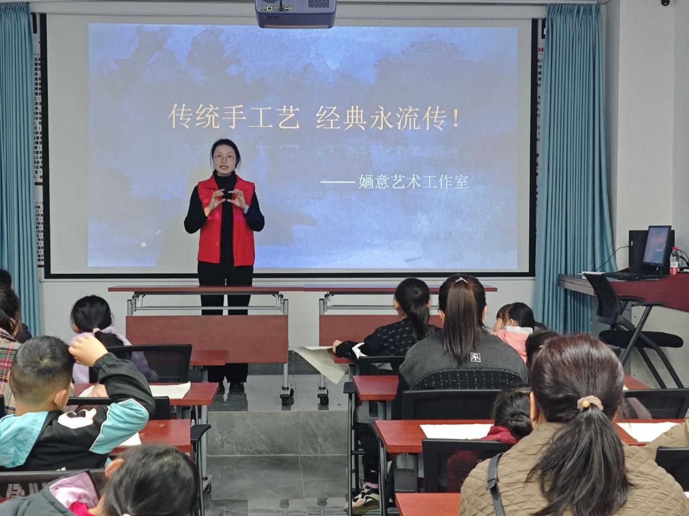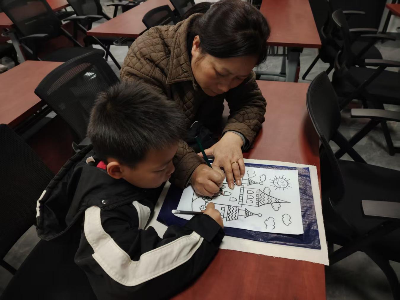 活动现场,社区主持人介绍活动背景与流程后,系团总支代表与社区负责人先后发言,阐释非遗传承与高校志愿服务结合的意义。建筑系副主任、非遗传承人王丽老师通过PPT,用通俗的语言讲解蜡染的历史渊源、工艺技法与美学价值,互动提问环节更是调动起现场氛围。实操体验环节中,志愿者分组示范蜡染操作流程,围绕图案绘制、封蜡固形等步骤细致讲解安全要点,随后一对一指导亲子家庭动手创作,鼓励大家结合生活与社区元素设计专属作品。