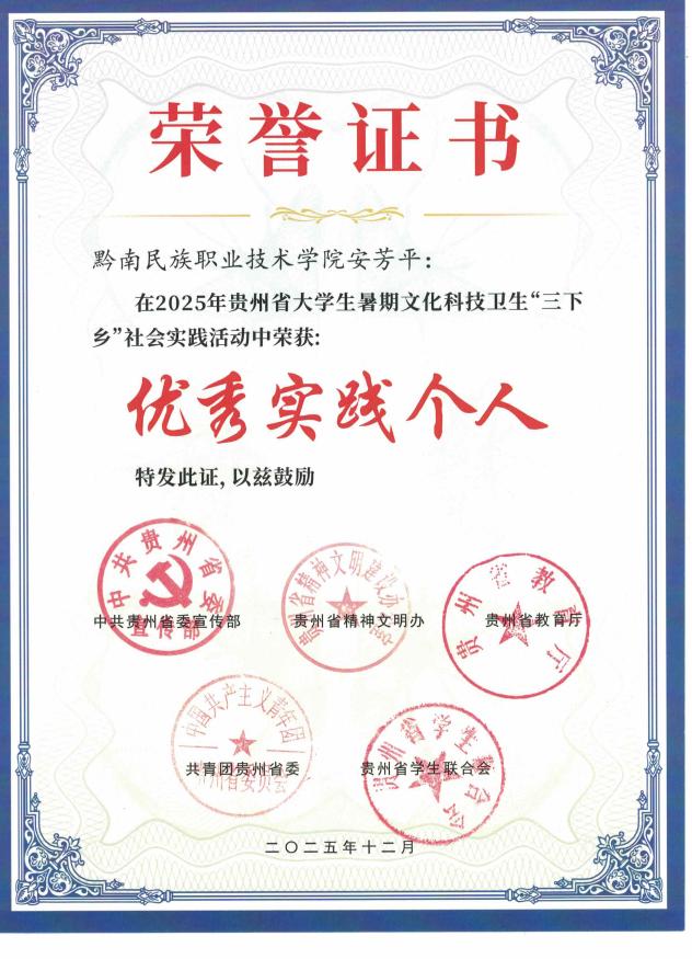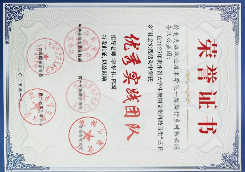 近日,由建筑系组织成立的一路黔行乡村振兴服务队,在2025年贵州省大学生暑期文化科技卫生“三下乡”社会实践活动中表现突出,荣获优秀实践团队称号;队员安芳平同学荣获优秀实践个人称号。
