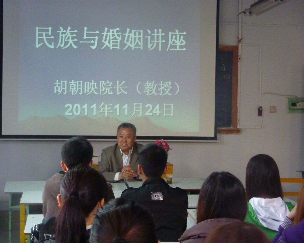 11 月 24 日 上午,院领导胡朝映院长在我系多媒体教室给2009级会计电算化二班学生作了题为“民族与婚姻”专题讲座,胡院长结合我国各民族的生活习俗,对民族与婚姻问题进行了精辟的分析,受到学生的一致好评。