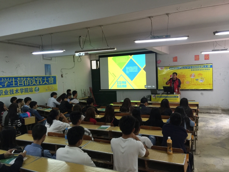 10月18日下午,2016年娃哈哈全国大学生营销实践大赛(黔南职院站)在我系西阶梯教室正式启动。出席启动仪式的有娃哈哈黔南地区市场部总监毕俊、系市场营销专业教研室主任沈远强等,我系市场营销专业80余名学生参加了当天的启动仪式。