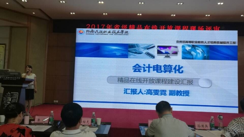 6月19-20日,我系会计电算化教研室申报的2017年贵州省精品开放在线课程——会计电算化现场评审在贵州交通职院进行。共有来自全省高职院校的46门课程参加本次现场评审会。按照省教育厅的要求和现场评审会的相关程序,参加现场评审会首先由课程负责人进行8分钟的现场陈述。然后,课程团队上台进行答辩,时间为3分钟。为搞好此次答辩,课程团队连日来加班加点,辛勤付出,团结协作,充分发挥团队精神,认真准备相关答辩材料,课程负责人的现场陈述和课程团队的现场答辩都得到了专家、同行的认可。