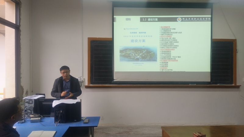 刘主任先详细了介绍了创优工作申报书、任务书、建设方案以及学院十三五规划,其次对我校现有数据指标和三年后的数据做了详细解释,最后对我院办学理念、办学思路、教学模式、学生培养模式等做了一次系统的概述。