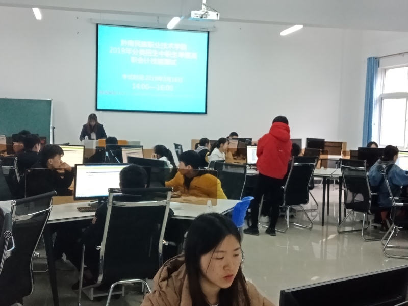 3月16日,会计系承担了黔南民族职业技术学院2019年分类招生中职单报高职会计技能测试考试。参加本次测试的学生应到125人,实到108人,会计技能测试采用计算机自动组卷方式进行网考,主要考核中职学生的会计电算化技能。