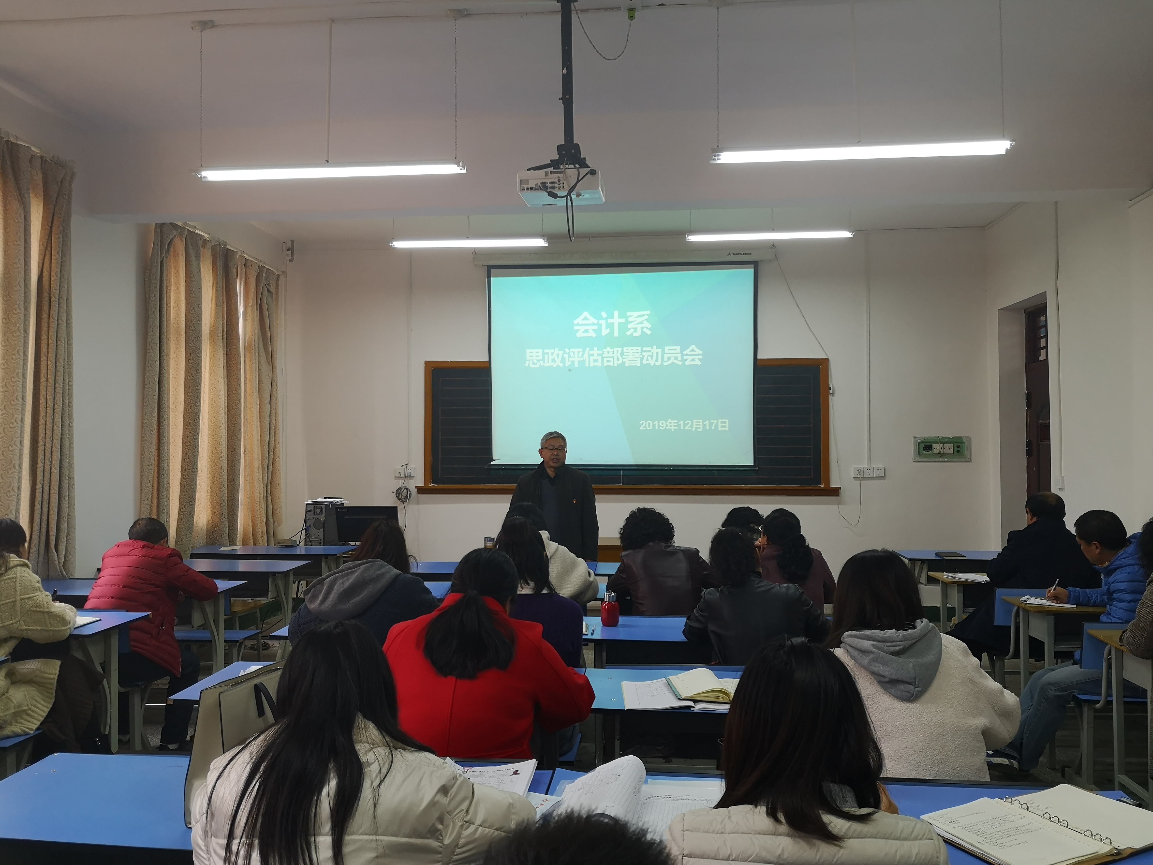 12月17日下午,会计系党总支根据学院思政评估相关工作要求及工作部署,在立信楼多媒体六召开全系教职工大会,对思政评估迎检工作作出安排,会议由党总支书记韩真良主持。