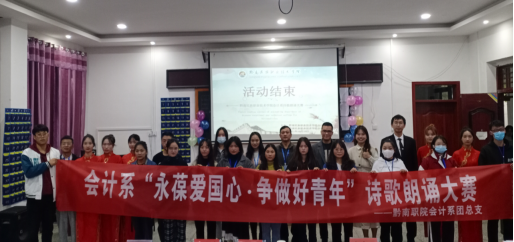 “青年兴则国兴,青年强则国强。” 为隆重庆祝中国共产党成立100周年,加强新时代学生的民族精神的培育与爱国主义教育,弘扬伟大的中华民族精神。黔南职院会计系团总支于2021年10月28日在多媒体五开展“永葆爱国心·争做好青年”为主题的诗歌朗诵大赛,出席本次活动的有: 潘冬生、韦睿、罗国佩等评委老师和15名参赛选手以及各班级团支部代表。