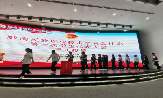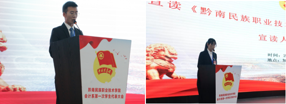 紧接着,谢玲玲代表会计系第五届学生会作《黔南民族职院技术学院会计系第五届学生会工作报告》;办公室部长苏婷婷宣读《黔南民族职院技术学院会计系学生会章程》,学生会副主席张飞作《黔南民族职业技术学院会计系第一次学生代表大会提案工作报告》,纪检部副部长吴泽想宣读《第六届学生会主席团候选人资格审查工作报告》。