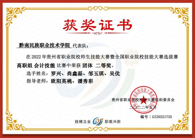 3.2022年贵州省职业院校技能大赛会计技能赛项二等奖;