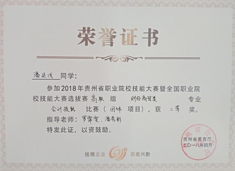 1.2018年贵州省职业院校技能大赛会计技能赛项二等奖;