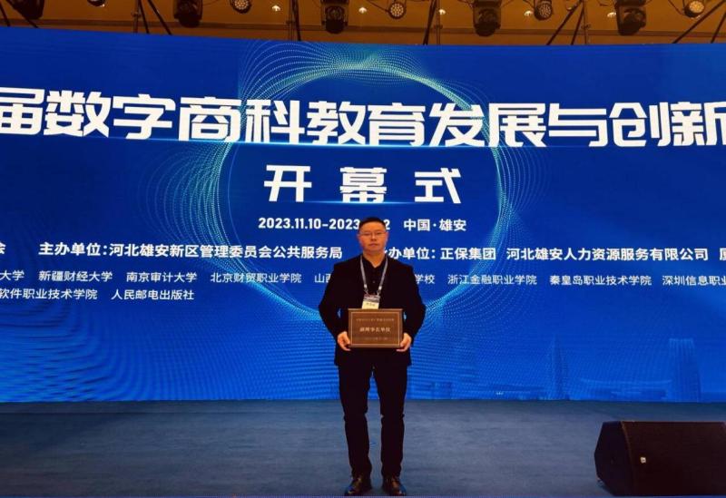 11月11日,由中国商业会计学会指导,河北雄安新区管理委员会公共服务局主办,正保集团、河北雄安人力资源服务有限公司、厦门网中网软件有限公司承办的“第二届数字商科教育发展与创新大会”在中国雄安胜利召开,共有来自全国340多所院校的领导、专家学者、行业学会及企业代表700余人参加会议,我院作为全国会计行业产教融合共同体副理事长单位受邀参加大会,我院会计系主任刘天和出席大会并接受授牌。