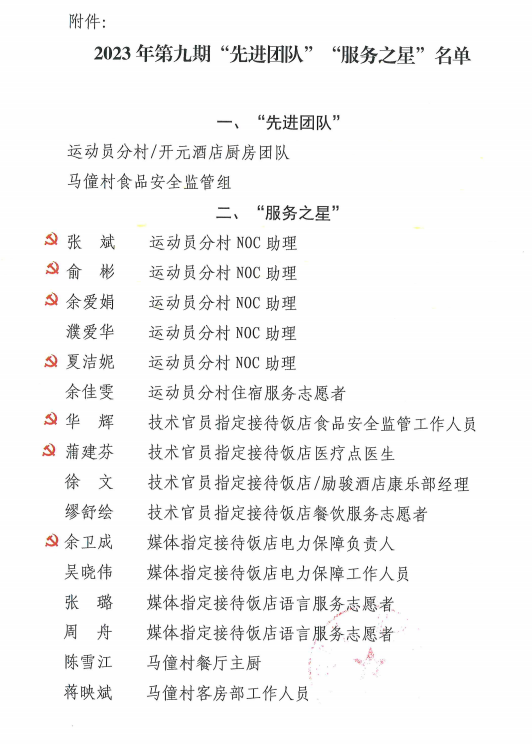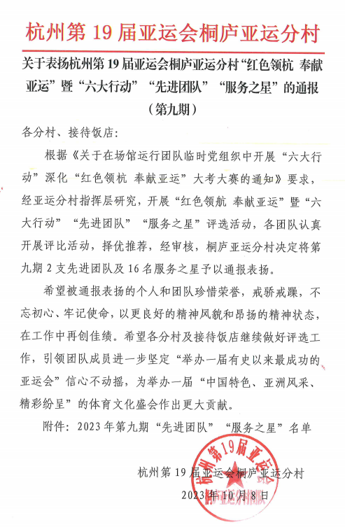 近日,第19届杭州亚运会落下帷幕。我系选派的优秀青年学子蒋映斌在志愿服务中荣获杭州第19届亚运会桐庐亚运分村授予“服务之星”称号。
