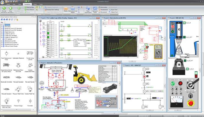 YL-Famic仿真软件是为未来各个水平的技术人员和工程师 培训提供完整的软件解决方案,如图(1-1)所示 。软件提供直观的设计、动画演示、模拟和分析电路。和用户友好的环境。它与控制系统、传感器与执行机构的交互极其方便。用它做设计、仿真模拟、调试以至维修及故障判别会非常有用,可大大提高效率。教师能够在较短的时间内向学生呈现更多的内容,提高学生理解概念和排除故障,更好的理解理论知识,吸收应用知识。
