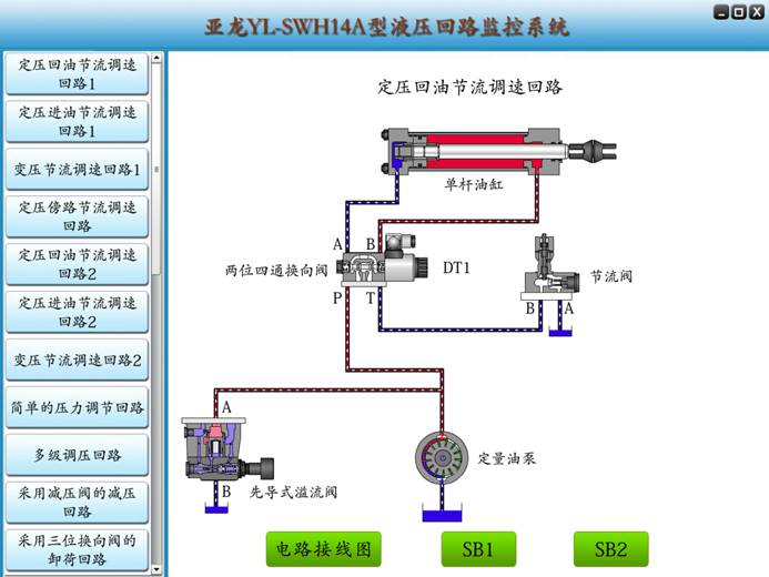 包含了26种液压回路:定压回油节流调速回路1、定压进油节流调速回路1、变压节流调速回路1、定压傍路节流调速回路、定压回油节流调速回路2、定压进油节流调速回路2、变压节流调速回路2、简单的压力调节回路、多级调压回路、采用减压阀的减压回路、采用三位换向阀的卸荷回路、采用二位二通电磁阀的卸荷回路、平衡阀的平衡回路、采用顺序阀的顺序动作回路、采用行程开关的顺序动作回路、采用继电器的顺序动作回路、采用液控单向阀单向闭锁回路、采用液控单向阀双向闭锁回路、采用O型换向阀的锁紧回路、采用调速阀串联的调速回路、采用调速阀并联的调速回路、采用调速阀短接的速度换接回路、采用并联调速阀的同步回路、差动控制回路、采用变量泵的容积调速回路和采用变量泵和调速阀的复合调速回路。