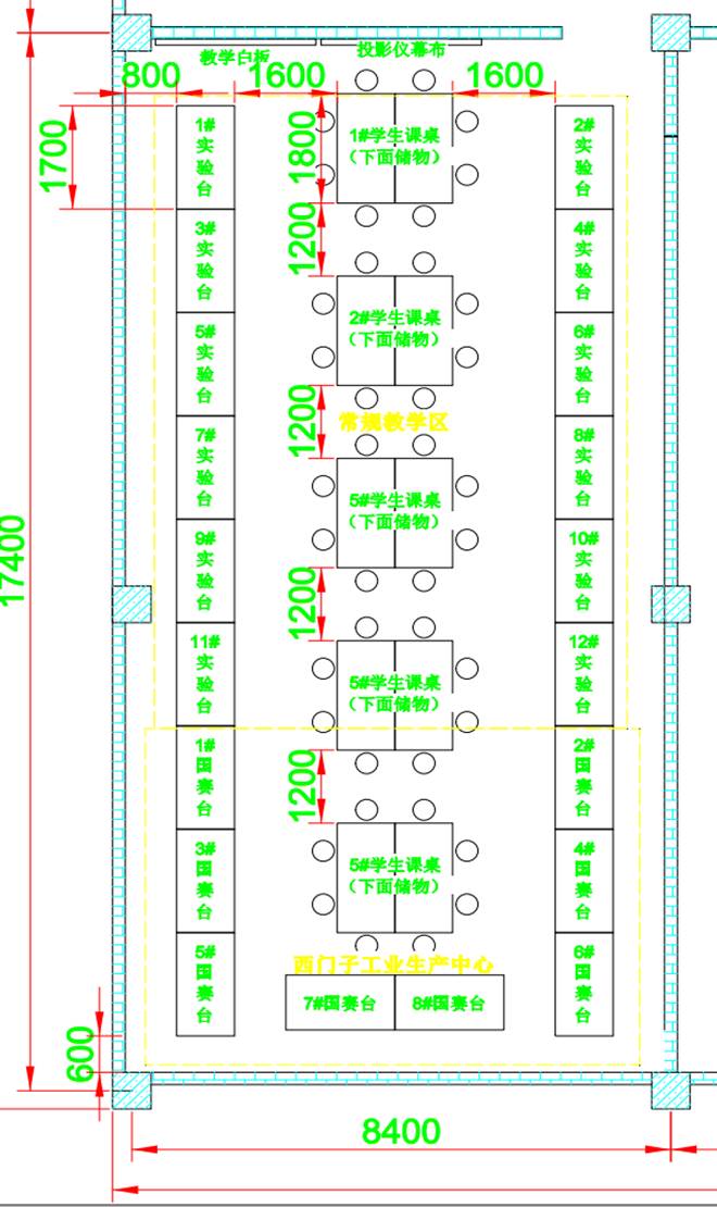 技能提升(国赛)实训室建在设在基础实训室的里面,计算建设8个实训台。其中1#、2#、3#、4#、5#、6#国赛实训台排列在实训室两侧,并紧挨着基础实训台,7#、8#国赛实训台排列在实训室底侧。实训台与墙壁之间的间隔为80厘米,方便人员到设备后面检修。