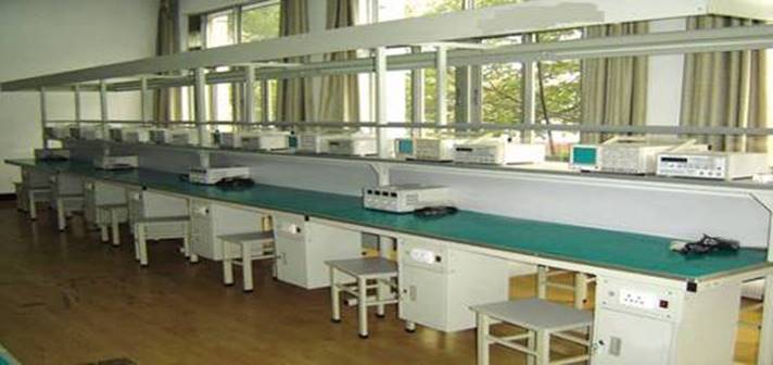 该实训室是模拟电子产品的生产加工过程而为学生提供的技能型实训室。可进行元件焊接、补焊、调试、检测、维修等电子产品生产加工操作模拟。用于培养学生的实际动手操作能力,使学生了解电子产品制造过程、熟悉电子产品工艺,掌握电子产品的操作技能,摸拟企业实际生产现场进行零距离的实训操作。