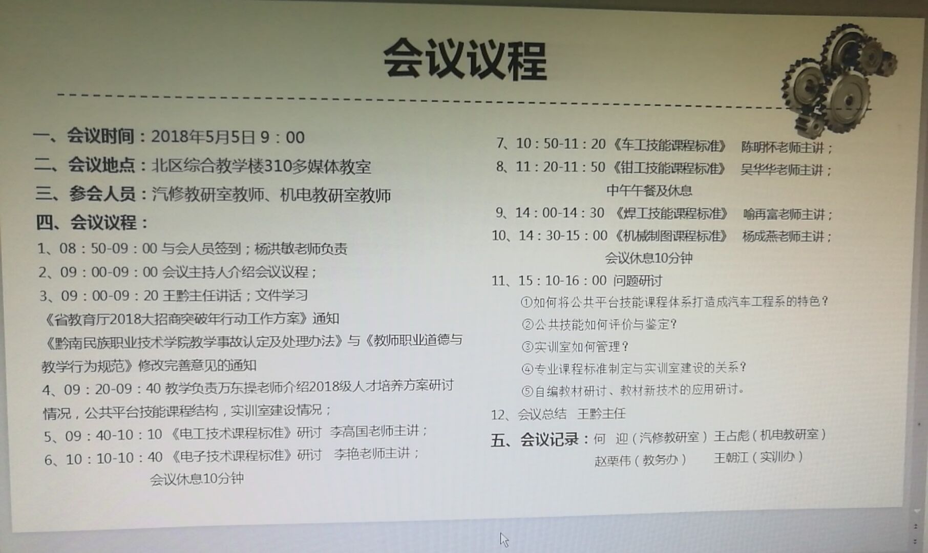 为深化黔南职院教学诊断与改革工作,2018年5月5日,汽车工程系全体专业教师就公共技能平台课程标准进行研讨,教学负责人万东操老师主持。