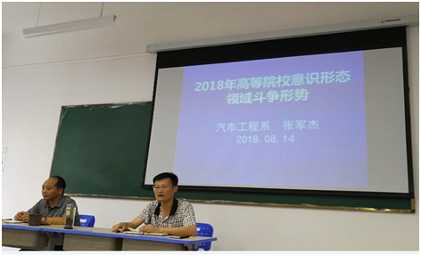 为深入贯彻落实党的意识形态工作责任制,深化汽车工程系教职工与党员对意识形态工作的认识,加强全系教师意识形态能力建设,8月14日下午,汽车工程系党总支组织开展了意识形态专题讲座会,系主任王黔主持会议,系总支书记张军杰进行授课。