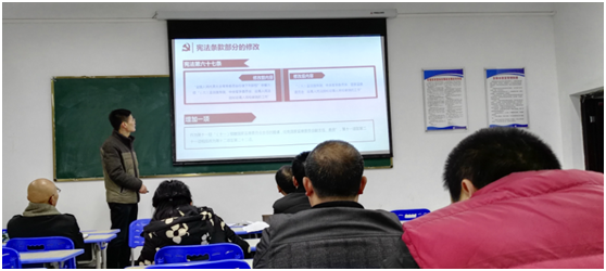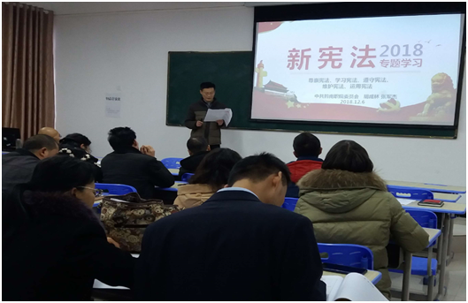 在建工大楼新312教室,全系教职工集体学习《宪法(2018年修正案)》,活动由系党总支负责人张军杰主持,受学院党委副书记、院纪委书记胡成林同志委托,张军杰同志用时一小时做了《新宪法2018专题学习》讲座,从宪法的制订和历次修宪情况开始说起,到2018年新宪法做出修正的意义结束。全体教职工认真听讲,了解了宪法修正案的重大意义和重要内容。