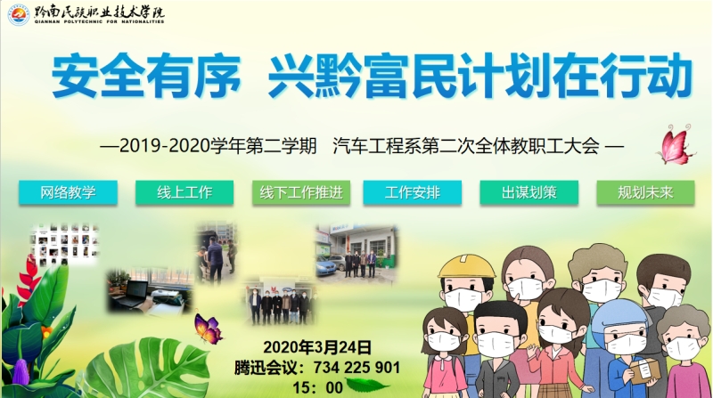 2020年是“贵州省职业教育兴黔富民行动计划”实施第一年,在目前贵州疫情控制情况良好的环境下,汽车工程系党总支书记张军杰、负责人万东操带头深入推进汽车专业群建设。通过互联网腾迅会议开展工作布置;设计线上调查问卷向贵州交职院、贵州电子信息职院、贵州电子信息科技职院等职业教育领域专家,向黔南州工业企业、汽车流通企业、汽车维修行业按照问需于师生、问计于专家的思路开展汽车专业群未来规划。