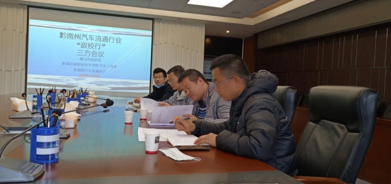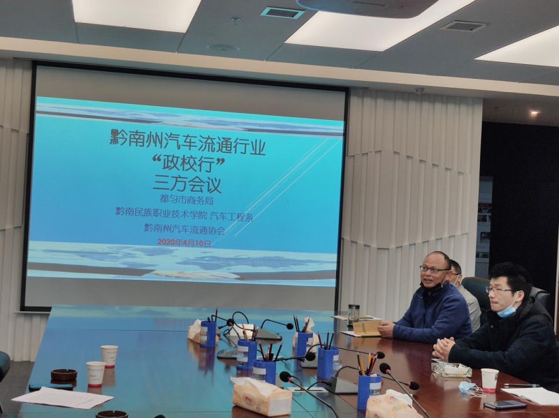 4月10日,黔南职院党委委员、副院长张泽宽、汽车工程系党总支书记张军杰、负责人万东操、都匀市商务局王堃科长,黔南州汽车流通协会谭金会长等人在黔南职院召开“政校行”三方会议。三方商议,加快推动黔南州汽车流通协会的组建;打造黔南职院汽车专业群、都匀市汽车流通行业发展命运共同体;建立汽车流通行业高技能人才和教师双向聘用机制;试点新时代新型学徒制人才培养模式,开设“卓越汽车营销师”新型学徒制班;推动国家职业教育改革“1+X”证书制度在黔南州的实施;将企业文化融入校园,用“工匠精神”涵养校园,引导学生服务于都匀市、黔南州汽车流通行业发展,让更多优秀毕业生在当地就业创业;加快都匀市、黔南州汽车流通企业选人、用人机制改革;推动都匀市、黔南州汽车流通企业现代企业管理制度的建设。