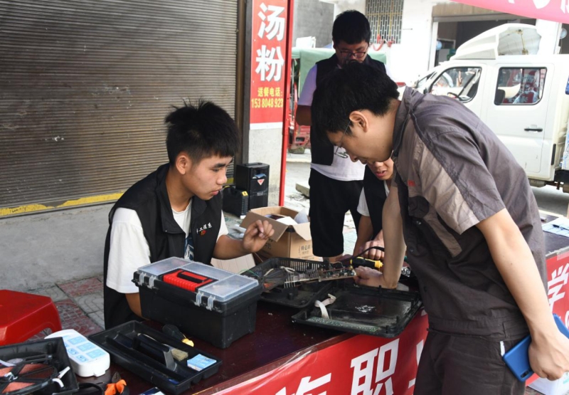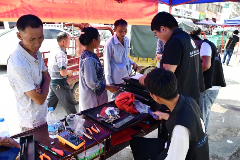 一大早,队员们搭建好维修点准备开始维修工作。来往的村民来到团队的摆摊点进行咨询,队员们积极地与村民们进行沟通,帮助他们了解免费维修活动。中国青年网通讯员 戴渊志 摄
