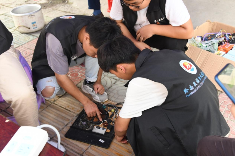 团队将坏电器拆开,埋头认真检查线路故障。队员们互相合作,配合默契,有条不紊进行维修。中国青年网通讯员 戴渊志 摄