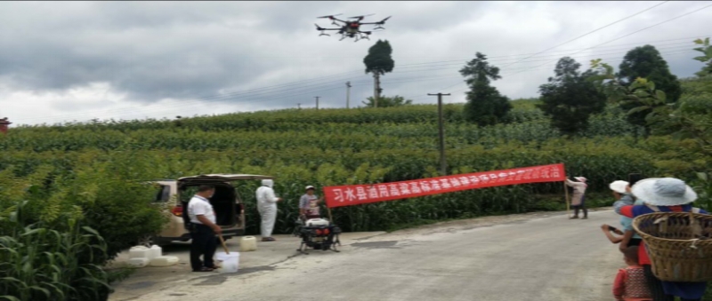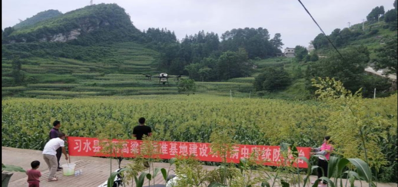 2020年8月,在遵义市习水县温水镇、程寨镇、同民镇,进行高粱农作物飞防植保9763亩。