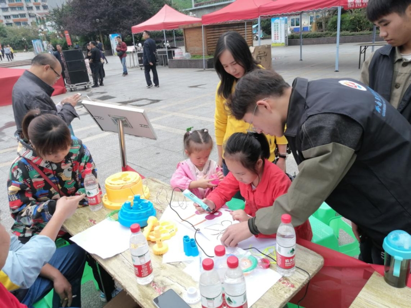 黔南职院科协代表队参加都匀市全国科普日活动 无人机植保团队为市民讲解科普知识 3D打印技术团队为小学生讲解3D打印原理和3D打印笔的使用方法 科普团队合影留念