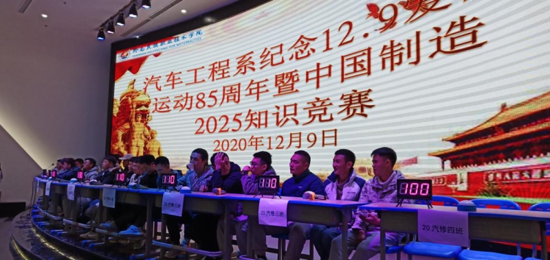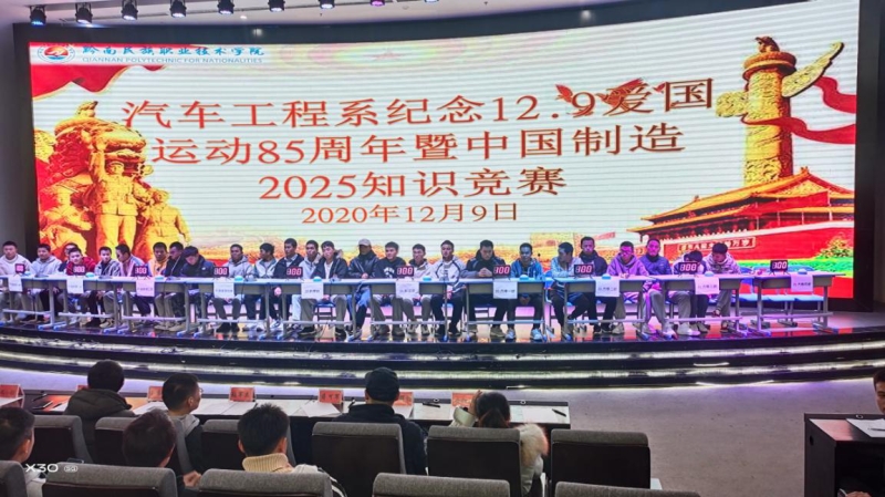 为纪念“一二·九”学生爱国运动85周年,弘扬爱国主义精神,深化职业教育内涵建设,拓宽同学们学习知识的渠道,提高学生学习兴趣。12月9日,由汽车工程系主办,多家企业协办的纪念“一二·九”系列活动——中国制造2025知识竞赛在黔南职院学术报告厅举行。