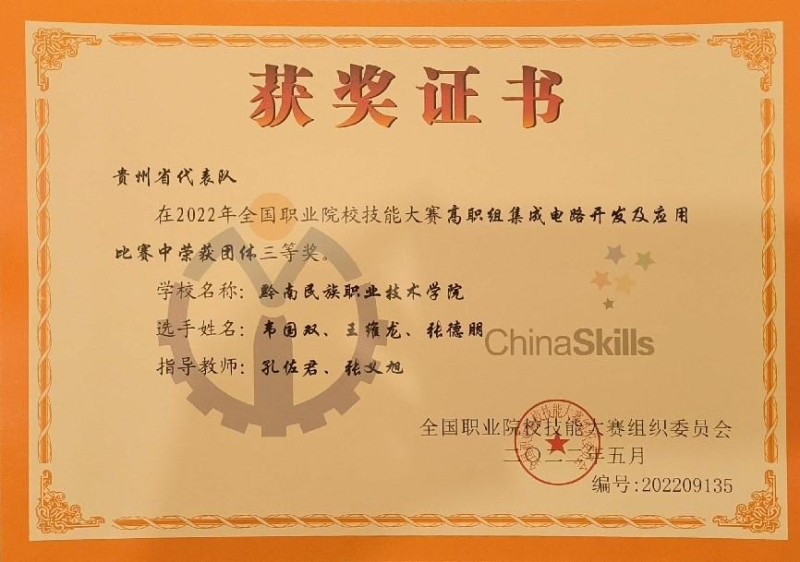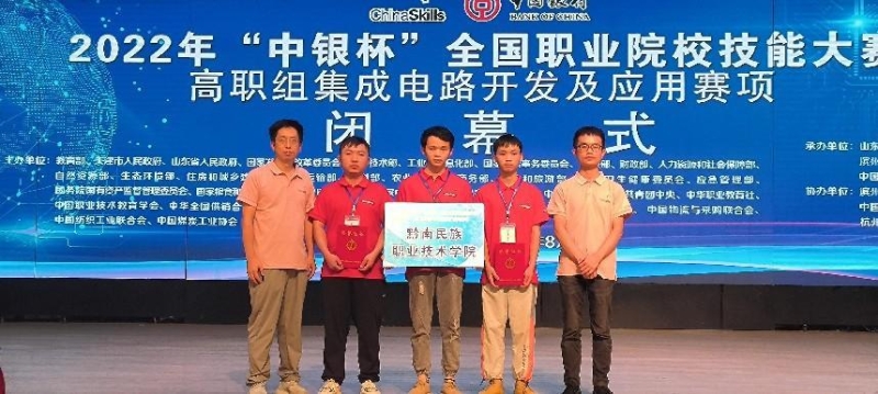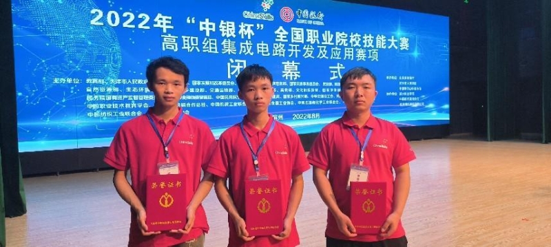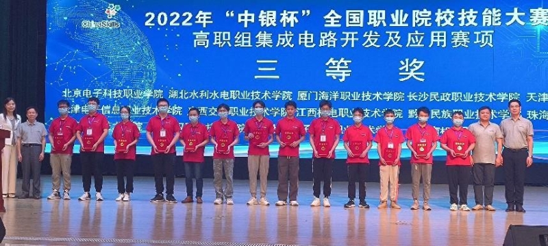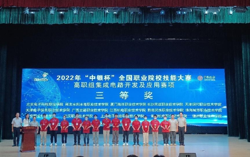 8月29--31日,由教育部、国家发展和改革委员会、工业和信息化部等主办的2022年“中银杯”全国职业院校技能大赛高职组“集成电路开发及应用”赛项在山东省滨州市滨州职业学院落下帷幕,我院参赛队再创佳绩,荣获团体三等奖。 本次比赛的“集成电路开发及应用”赛项历时两天,要求参赛选手在规定时间内完成集成电路原理图和版图的设计与仿真、集成电路工艺仿真操作、集成电路应用产品装调和功能程序编写及测试、模拟和数字集成电路测试工装设计制作和芯片参数测试等任务。经过激烈的角逐,来自全国各省、市、自治区的54支代表队中有30支分别获得一等奖、二等奖、三等奖。我院参赛选手分别为汽车工程系2017级机电设备维修与管理五专班韦国双同学、2021级机电一体化(2)班王维龙和张德朋同学,他们在学院各级领导的关心鼓励和指导教师孔佐君、张义旭的悉心指导下,夜以继日地训练,作为贵州省的代表队之一参加此次比赛,所获奖项突破了我院在“集成电路开发及应用”赛项中曾经获得的成绩,充分体现了我院学子顽强拼搏、奋勇争先的精神。