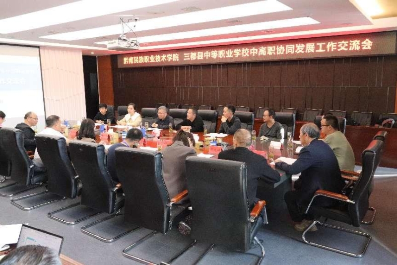 在实地参观后,黔南职院与三都职校就如何贯彻中高职协同发展工作,培育社会所需德技双修的高素质专业人才进行研讨。学院党委书记罗俊,副书记韦永革为深化校院合作,提出了建设性意见。副院长张泽宽就推进中高职贯通专业领域各方面开展深入细致的交流。