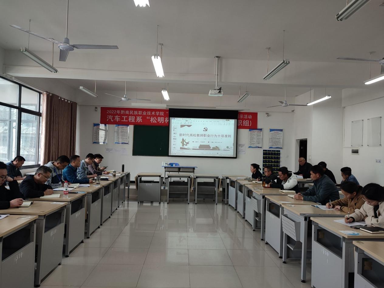 3月14日下午,学院党委副书记韦永革赴汽车工程系给全体教师开展思想政治专题教育,他从教师的根本任务谈起,每一名教师要抓好课堂教学主阵地、守好课堂主渠道,把立德树人融入对学生的思想道德教育、专业知识及专业技能教育、社会实践教育等各环节,贯穿教育教学的全过程。要以学院的“33753”育人体系为抓手,将学院的国防教育特色案例、全国向上向善好青年刘道敏事迹、生态文化教育等优秀育人成果传播好,从而,引导学生树立正确的世界观、人生观、价值观。