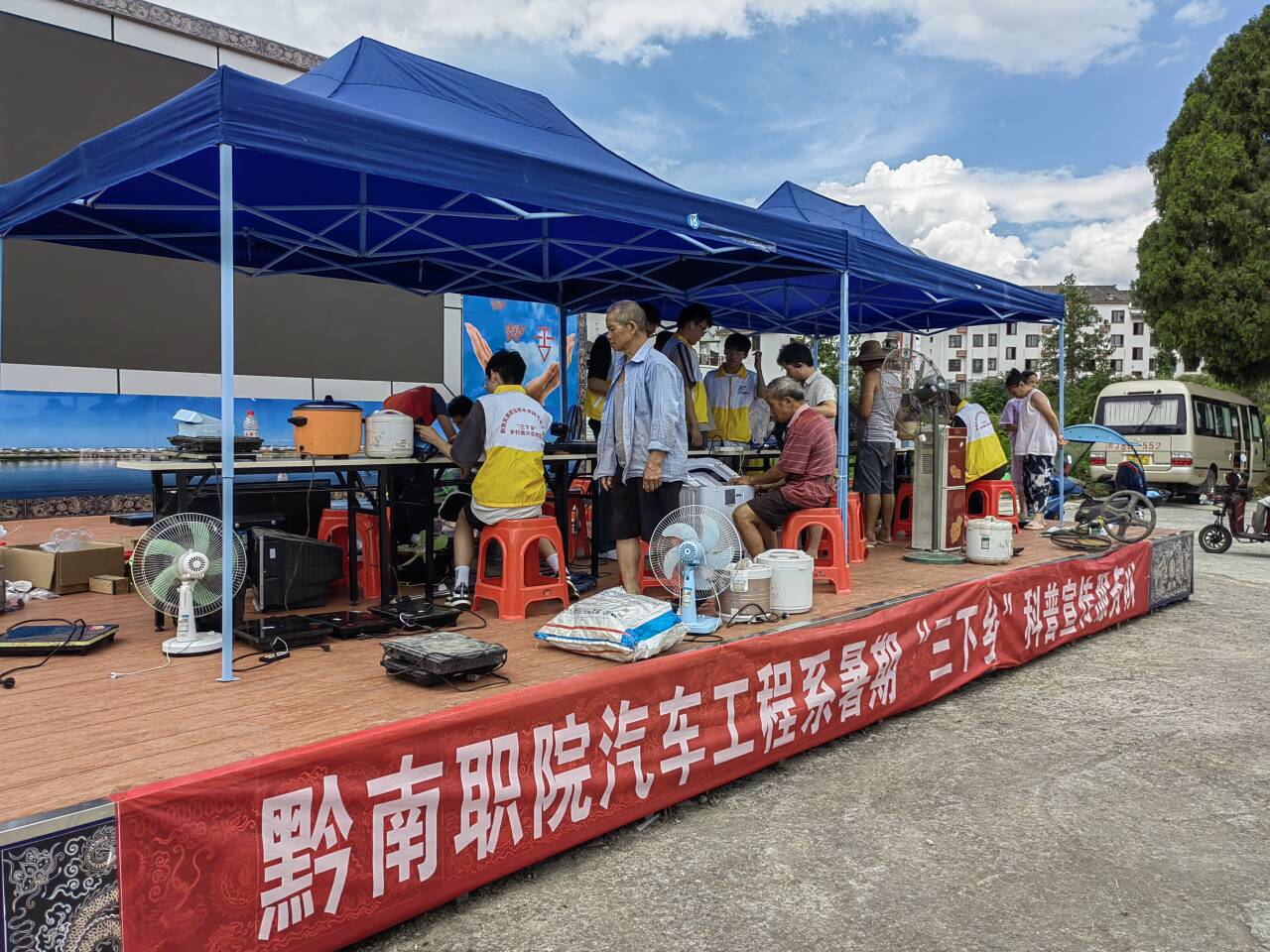 2024年7月15日一早,汽车工程系总支暑期“三下乡”科普宣传服务队师生计18人,乘坐学院校车,来到三都显中和镇雪花湖社区,同时,黔南州汽车维修协会党支部派出4名人员,一起到场,共同为该社区老百姓,义务维修小家电和小型农机具,解决了当地村民电器、农机损坏后无法及时维修的困扰,以师生的汗水和实用技能,开展了一次别有意义的主题党日活动,学院机关系总支书记何毅、驻村工作队徐发国老师亦到现场参加。