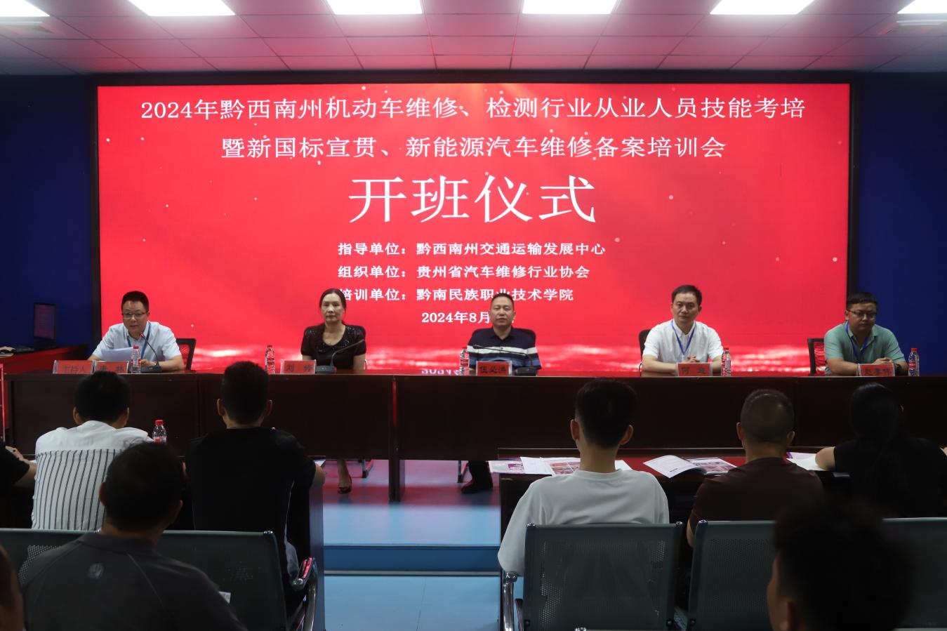 开班仪式上我院汽车工程系新能源汽车专业负责人何迎、黔南州汽车维修行业协会常务副会长赵栗伟与黔西南州交通运输发展中心领导、贵州省汽车维修行业协会副会长唐林对此次培训工作做要求。