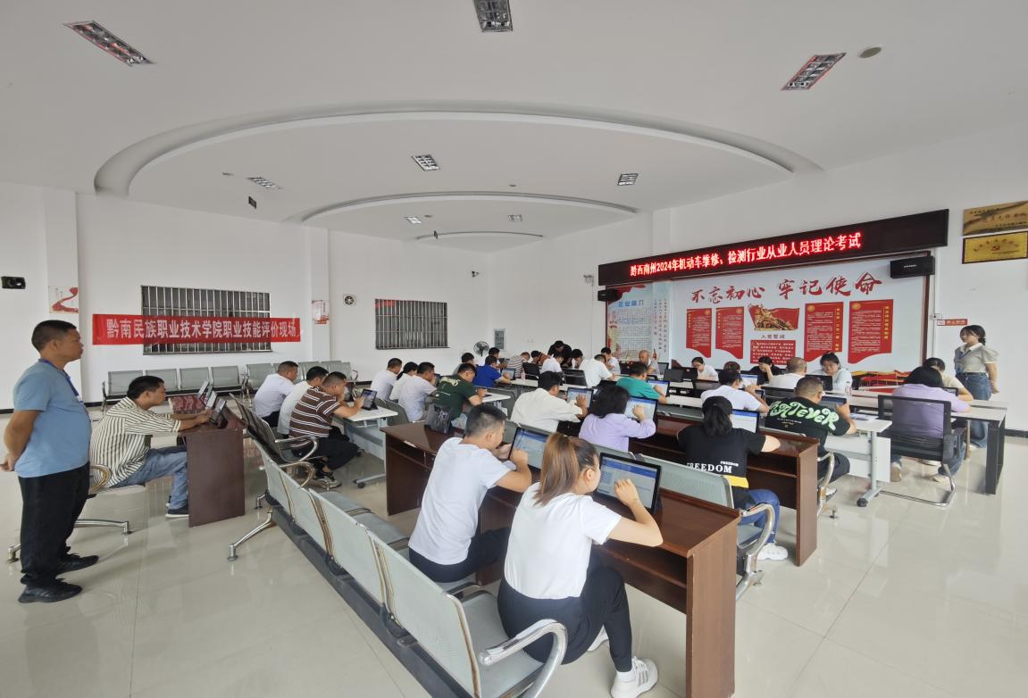 在黔西南州交通运输发展中心的指导下,应黔西南州汽车维修行业从业人员职业技能水平鉴定实际需求,我院汽车检测与维修技术、新能源汽车技术专业骨干教师(考评员)按考评标准要求,从题库中随机抽取理论题,对黔西南州汽车维修从业人员进行网络无纸化理论考评和线下实际操作能力考评鉴定。下图4、图5分别为理论和实际操作考评场景。