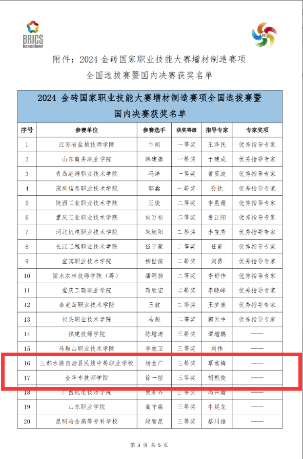 9月21日,来自全国的35支队伍参加了在山东商务职业学院进行的2024年金砖国家职业技能大赛“增材制造”赛项全国选拔赛暨国内决赛。我系选派到三都县中等职业技术学校进行“组团式”帮扶的教师杨金广,代表该校经过层层选拔,作为贵州省代表选手参赛,经过精心备赛和现场比拼,荣获国赛三等奖。为我院在贵州省双高校建设中增彩!