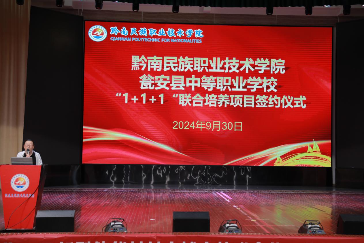 到会双方学校领导现场签署”“1+1+1”联合培养项目框架协议”。学院何琳副院长发表讲话。她在讲话中代表学院对新同学给予深切关怀和殷切期望,希望同学们能够充分利用学院提供的资源和机会,努力学习,积极进取,最终成长为德才兼备的高素质技术技能型人才。瓮安县中等职业学校党委书记刘龙坤在讲话中表示,通过“1+1+1”联合培养项目的校际合作,将实现资源共享,优势互补,共同培养高素质技术技能型人才。
