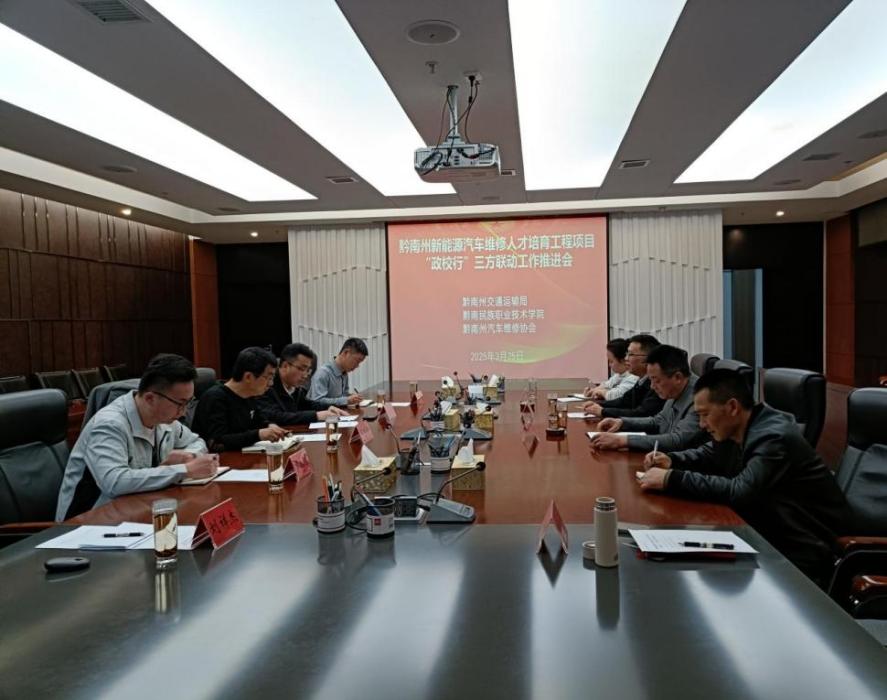 3 月 25 日,“黔南州新能源汽车维修人才培育工程” 政校行三方联动推进会在黔南职院举行,会议由黔南职院汽车工程系党总支副书记赵阳同志主持。黔南州道路运输发展中心主任柏虎、州汽车维修协会会长唐林、黔南职院汽车工程系主任万东操等参加会议。