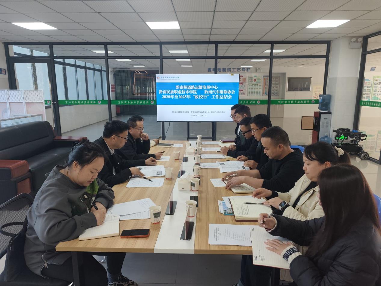 2025年11月13日,黔南州道路运输发展中心、黔南民族职业技术学院、黔南州汽车维修协会在黔南职院汽车工程系201会议室联合召开2020-2025年“政校行”合作工作总结会。此次会议由黔南民族职业技术学院汽车工程系主任万东操主持,相关专业负责人参加,黔南州道路运输发展中心主任柏虎、副主任李作勇,黔南州汽车维修协会党支部书记赵栗伟、秘书长张久圆,以及三方相关骨干成员参会。会议对五年合作成效进行了系统复盘,并对下一阶段深化协作工作作出部署。