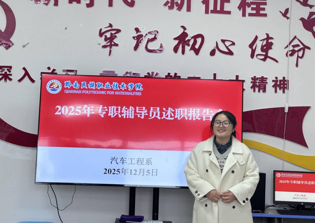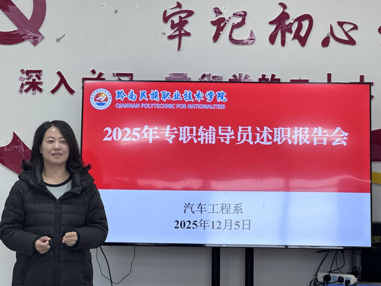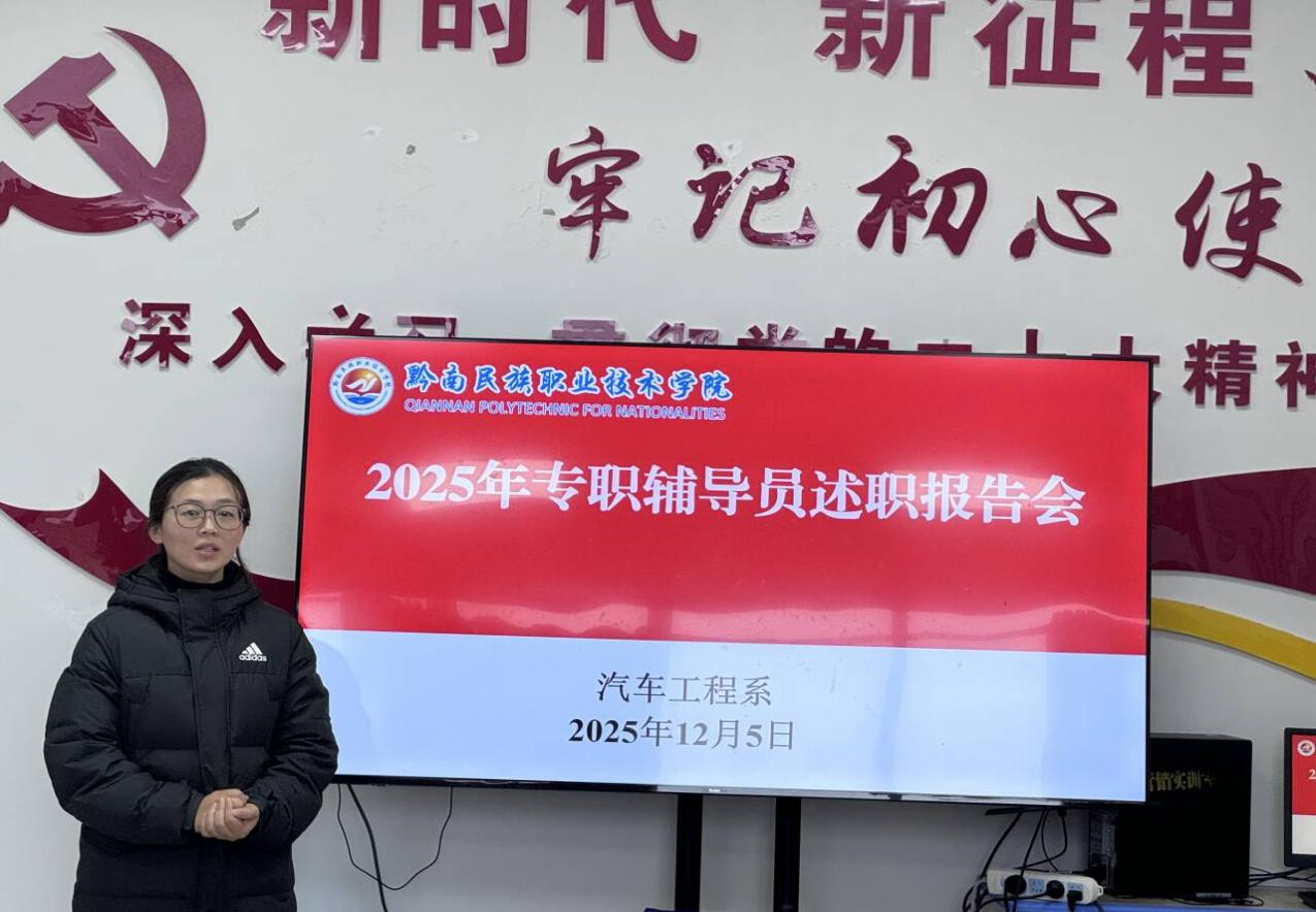 2025年12月5日,汽车工程系在201会议室召开专职辅导员述职会。系党总支书记杨均、副主任蒋可军、教务科主任杨屏及教师兰继红、杜显霞担任评审,韩晓春等七位辅导员述职。辅导员聚焦思政教育、班级管理等核心工作逐一汇报。