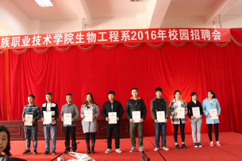 2016年12月10日上午,我校生物工程系2016年校园招聘会在中区三楼报告厅隆重举行,招聘会开始前还举行了一个简短的开幕式,由黔南民族职业技术学院党委韦永革副书记致开幕词,贵州大北农集团总经理助理杨青为我院2016年获得“大北农助学金”的同学颁发奖金和荣誉证书,最后由生物工程系张金华主任宣布招聘会开幕。