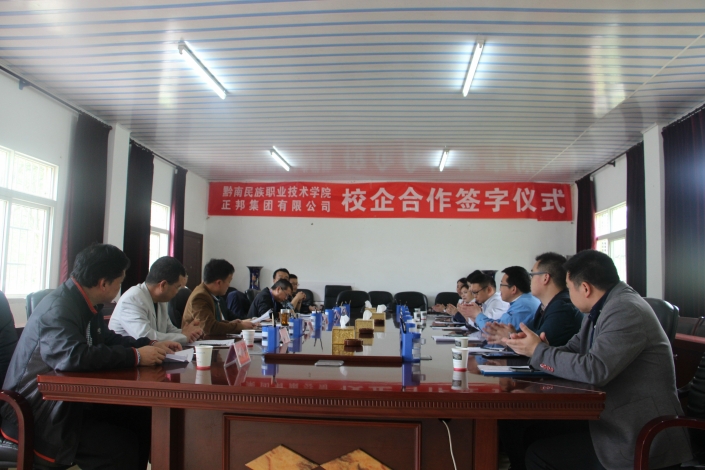 2017年4月18日下午,正邦集团有限公司与黔南民族职业技术学院进行校企合作共建“正邦班”签约仪式在学院第二会议室举行。正邦集团农牧事业部人力资源副总监李新昕、贵州片区总裁周东方、贵州片区人力资源部经理付成凤、正邦集团正邦商学院培训经理陈莎、正邦集团农牧事业部大学生负责人陈红娟、贵州片区招聘培训经理蒋灿、贵州片区发展经理王先国等7人,黔南民族职业技术学院院长饶辉、院党委副书记韦永革、生物工程系主任张金华、教务处副处长石铃林、招生就业处副主任潘奇、生物工程系副主任朱永毅、畜牧兽医教研室主任杨均以及畜牧兽医专业相关老师出席此次签约仪式。