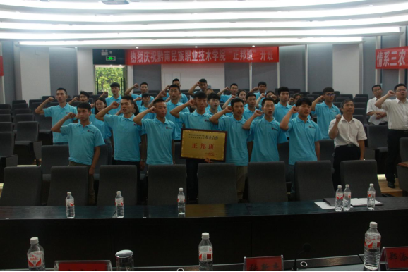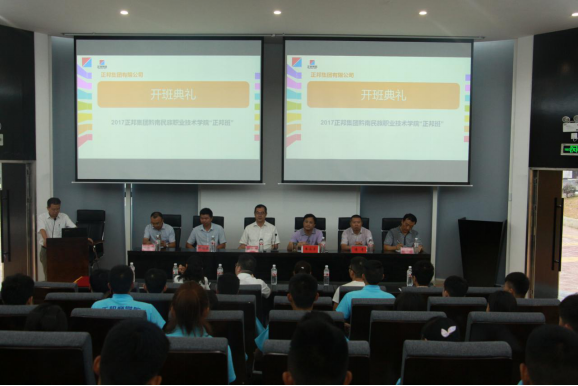 2017年8月13日上午十点,正邦集团有限公司与黔南民族职业技术学院进行校企合作共建“正邦班”开班典礼在学院知行楼多功能厅举行。正邦集团贵州片区副总裁张新杰、正邦集团养殖事业部经理郑添益、正邦集团贵州片区三都养殖总经理唐刚平、贵州片区人力资源部经理付成凤、贵州片区招聘培训经理蒋灿、正邦集团人力资源部负责人余超6人,黔南民族职业技术学院院党委副书记韦永革、招生就业处副主任潘奇、生物工程系主任张金华、生物工程系副主任朱永毅、畜牧兽医教研室主任杨均以及畜牧兽医专业相关老师出席此次开班典礼。